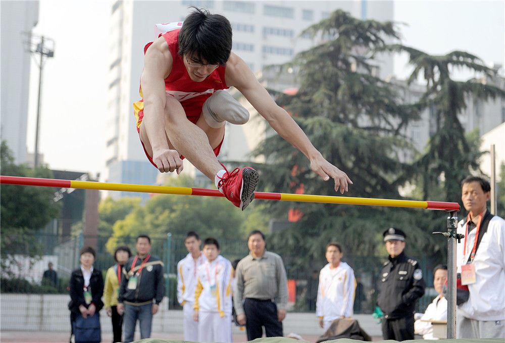 2010年10月29日,安徽省第五届残疾人运动会在合肥举办,赛场上315名残疾人运动员奋勇争先,展示身残志坚、超越自我、热爱生活的精神,尽情享受体育运动带来的激情与快乐。残疾人运动员王亮正在跳跃单杠比赛中。马启兵/视觉中国