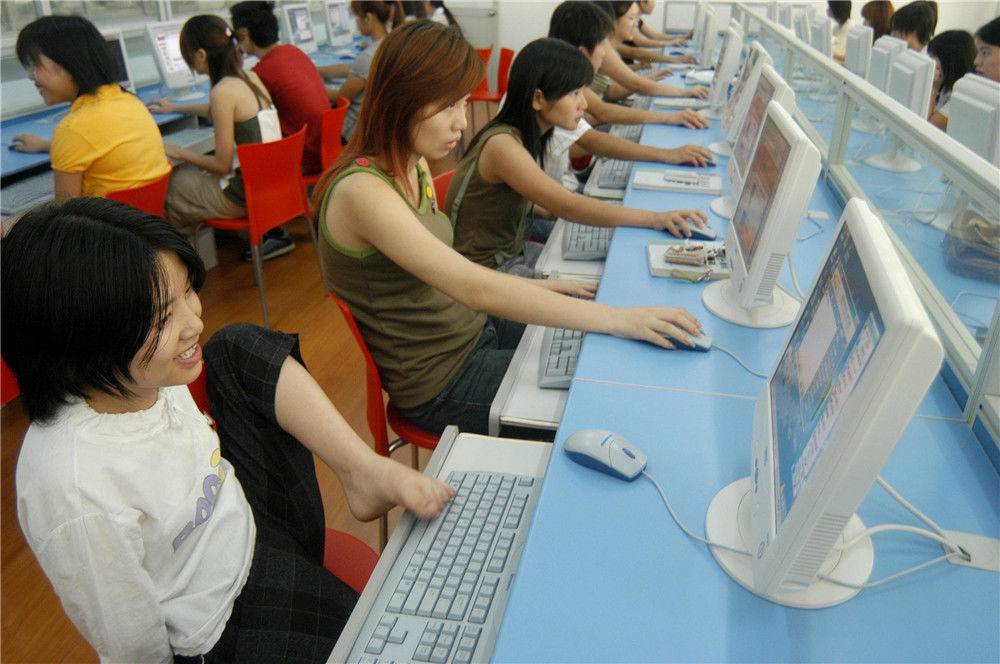 2004年7月9日,厦门东海学院一位失去正常人的双手,用脚读书的年轻人郑华梅。和其他同学一样,郑华梅也喜欢上网,喜欢用QQ在网上和网友聊天,她还有一个好听的网名雨花石。黄少毅/视觉中国