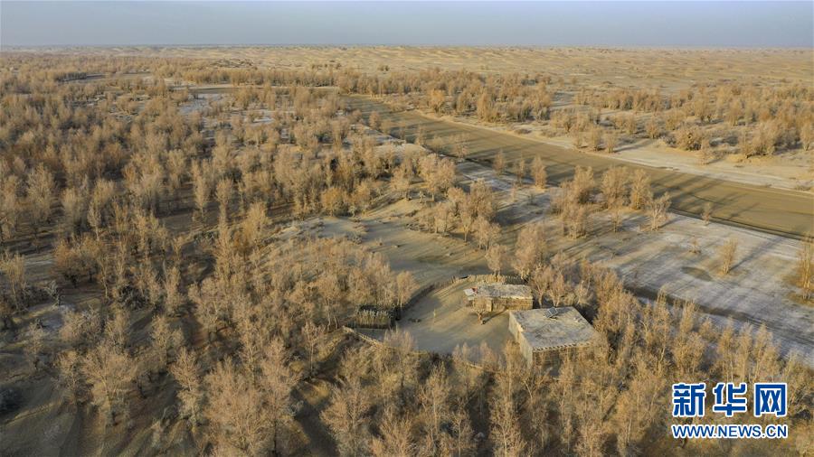 依明·买提库尔班原来的家地处塔克拉玛干沙漠腹地,掩映于胡杨林间(11月16日无人机拍摄)。新华社记者 胡虎虎 摄