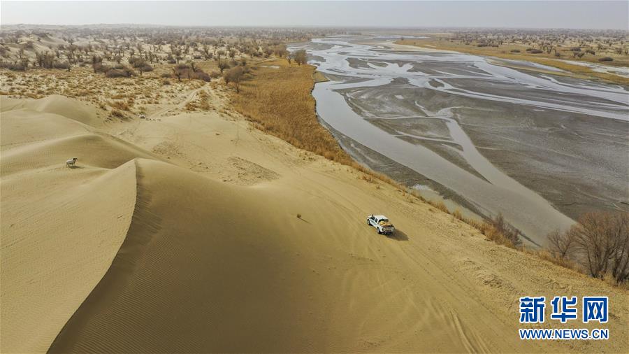 满载着依明一家和行李的车辆行驶在克里雅河畔,前往安置点,这一路需要不停翻越沙丘(11月18日无人机拍摄)。 新华社记者 胡虎虎 摄
