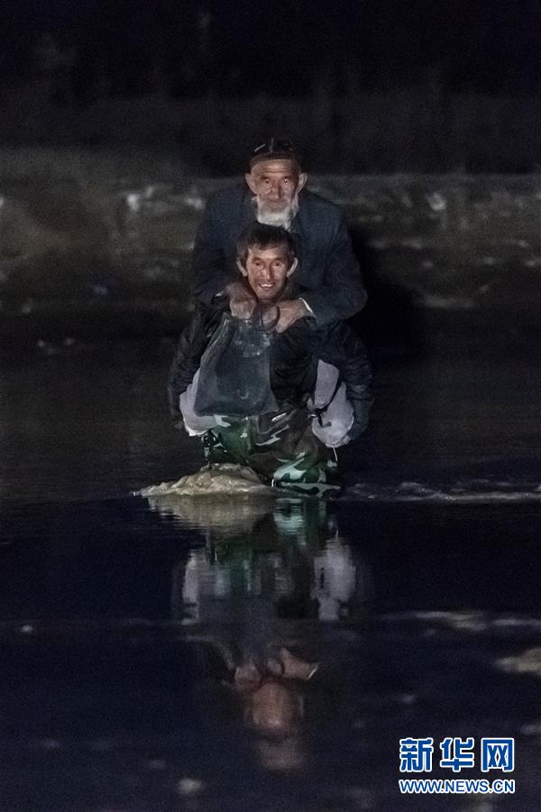 在前往易地扶贫搬迁安置点的路上,依明·买提库尔班背着老父亲买提库尔班·托合提蹚水渡过克里雅河(11月17日摄)。克里雅河上几乎没有桥,当地百姓一般都蹚水过河。新华社记者 沈伯韩 摄