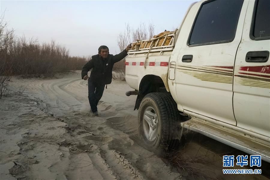 在前往易地扶贫搬迁安置点的路上,汽车陷到了沙地里,依明·买提库尔班在推车(11月17日摄)。 新华社记者 沈伯韩 摄