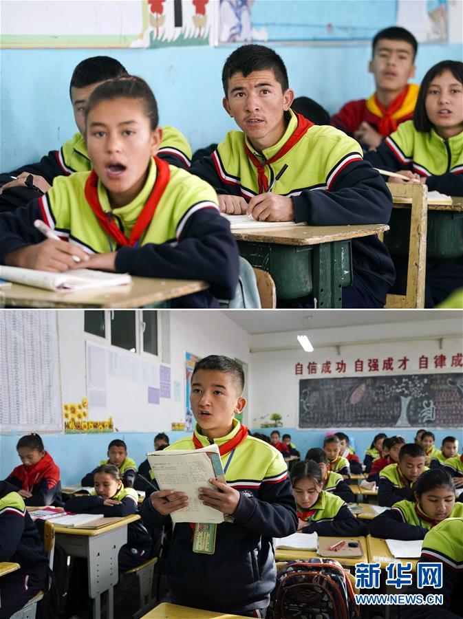 这是一张拼版照片。上图:在新疆于田县第一中学8年级7班,依明·买提库尔班的大儿子比拉力·依明(中)与县城里的孩子们一起上语文课(11月20日摄);下图:在新疆于田县第一中学7年级3班,依明·买提库尔班的小儿子如孜·依明(前)在语文课上回答老师提问(11月20日摄)。新华社记者 沈伯韩 摄