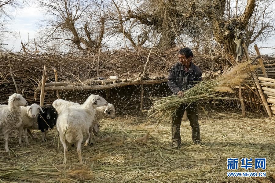 在新疆于田县达里雅布依乡五小队,依明·买提库尔班在自家羊圈里喂羊(11月15日摄)。 新华社记者 沈伯韩 摄