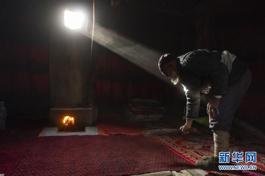 在新疆于田县达里雅布依乡五小队,依明·买提库尔班81岁的老父亲买提库尔班·托合提在家中打扫卫生(11月16日摄)。 新华社记者 沈伯韩 摄