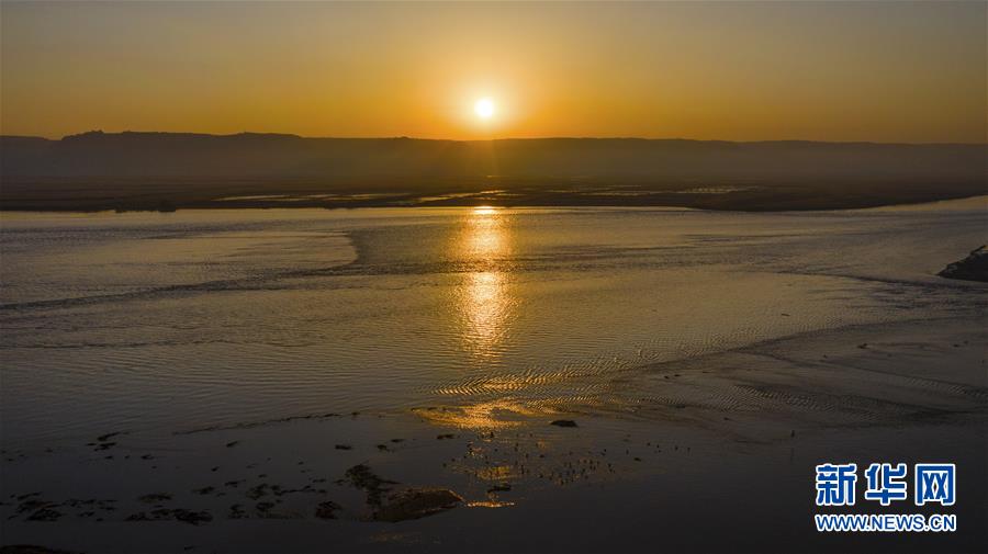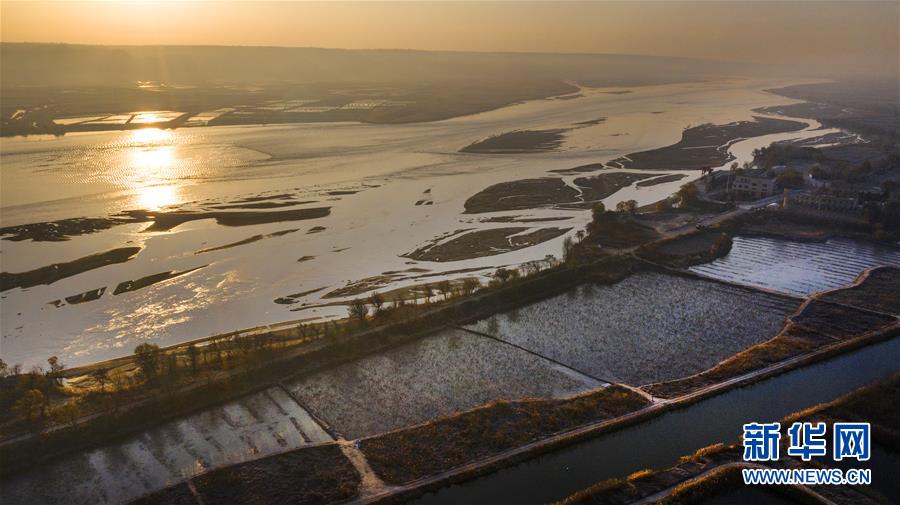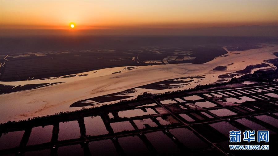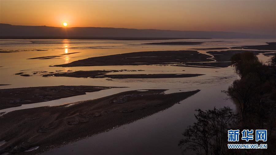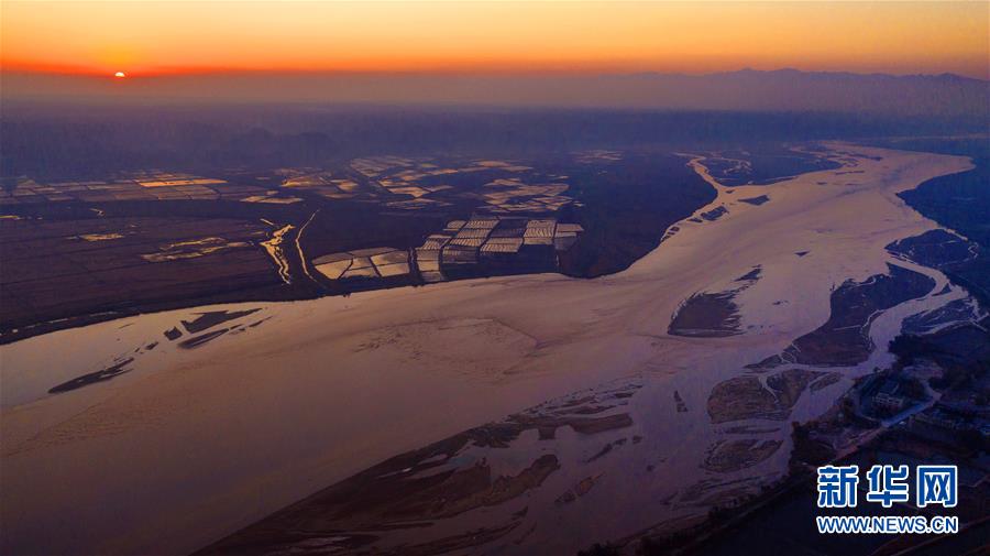 12月4日无人机拍摄的黄河合阳段日出景色。清晨,在黄河陕西省合阳段,河滩在朝霞的映照下,景色迷人。新华社记者陶明摄