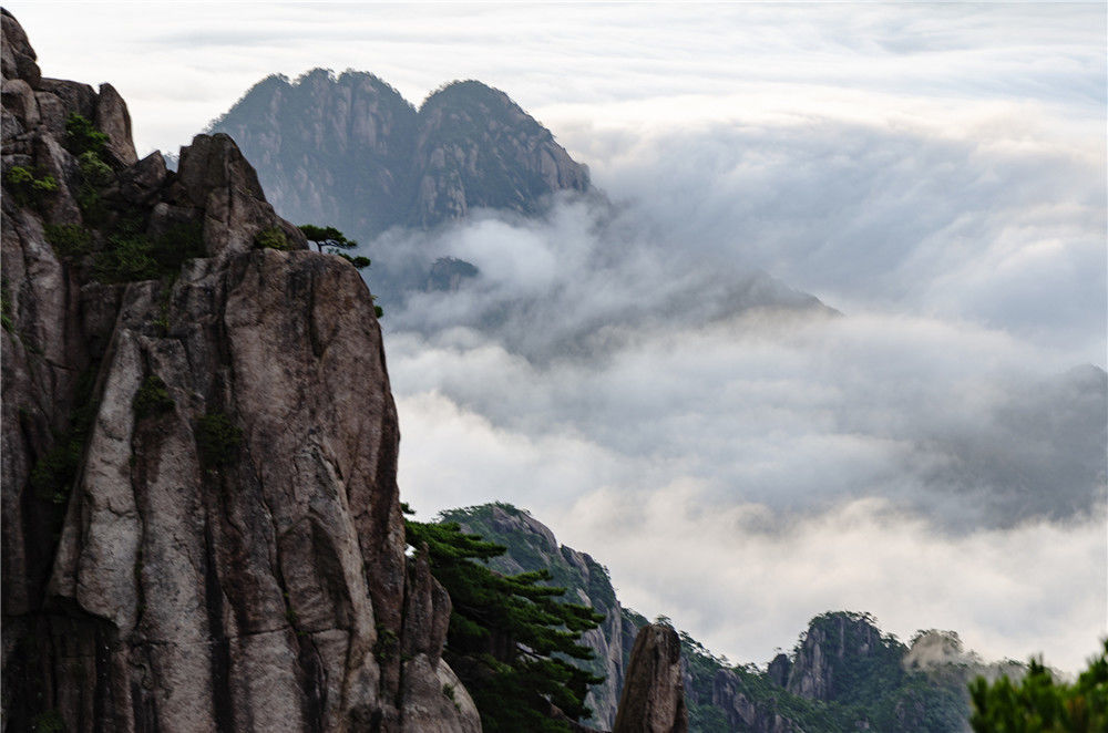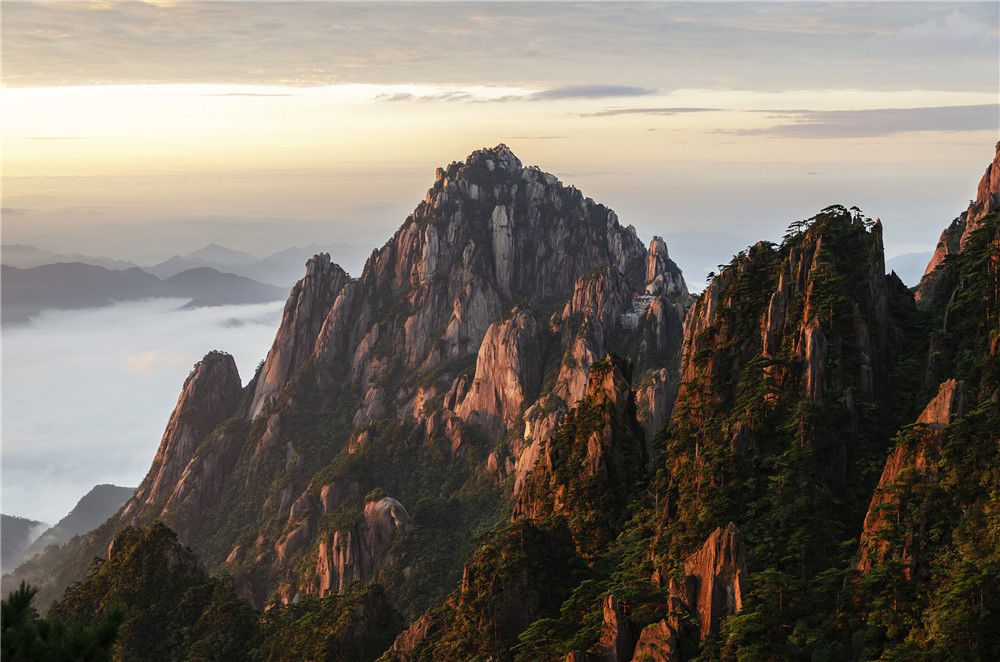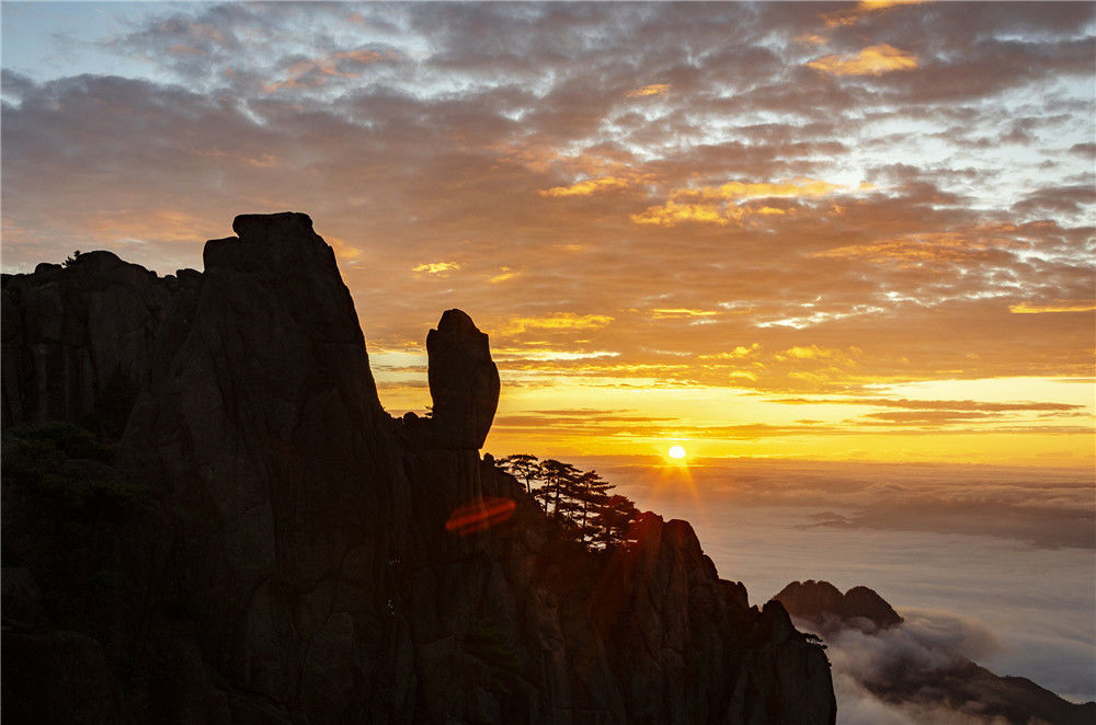 2019年9月5日早上,安徽黄山风景区,静态的峰林、巧石和苍松,与动态的云海、日出和溪水同框竞秀,美如画卷