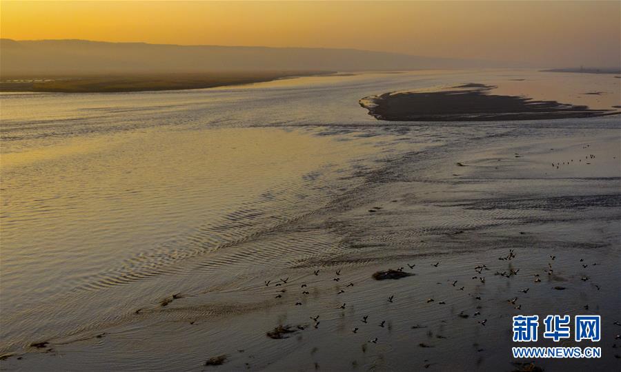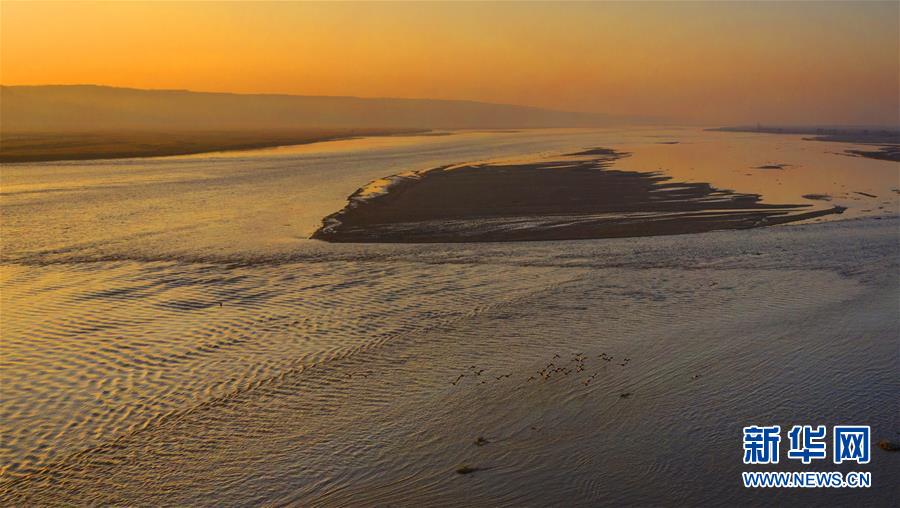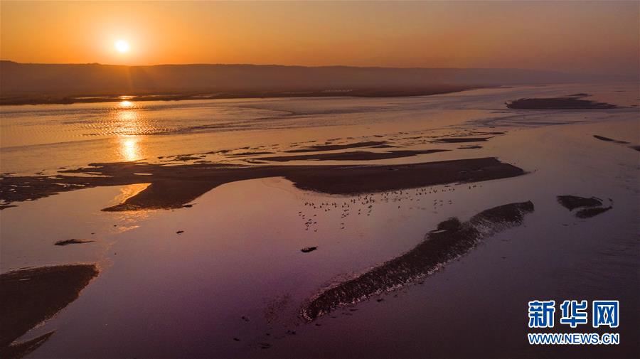 12月4日,一群鸟儿迎着朝霞在黄河合阳段飞翔(无人机拍摄)。清晨,在黄河陕西省合阳段,河滩在朝霞的映照下,景色迷人。新华社记者陶明摄