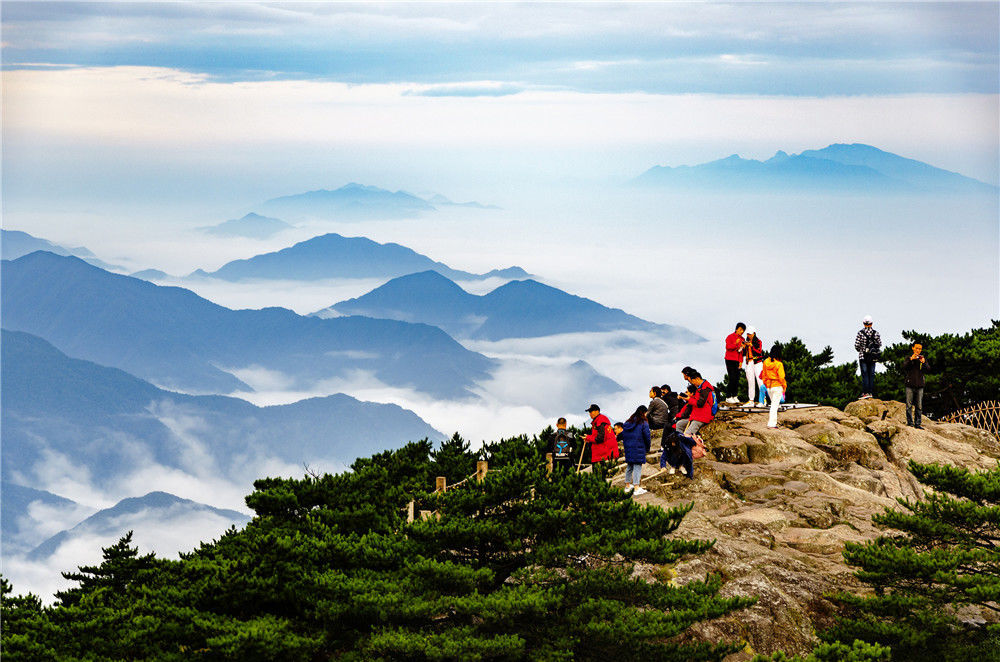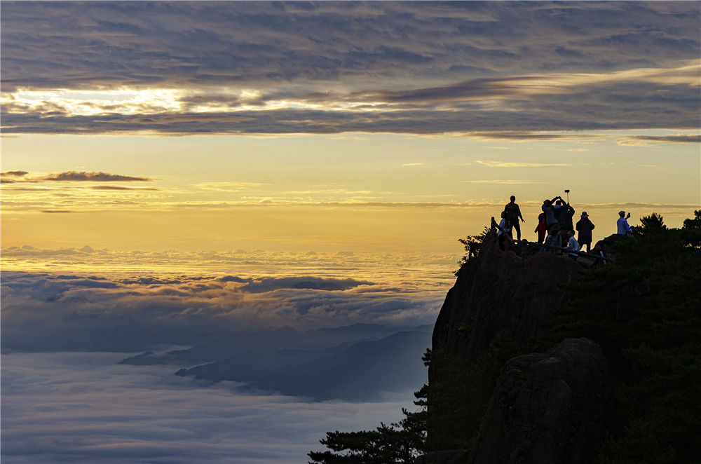 2019年9月5日早上,安徽黄山,许多游客在光明顶赏云海。