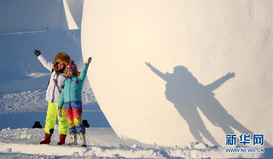 12月29日,在太阳岛雪博会园区,游客在雪雕作品前留影。新华社记者王建威摄