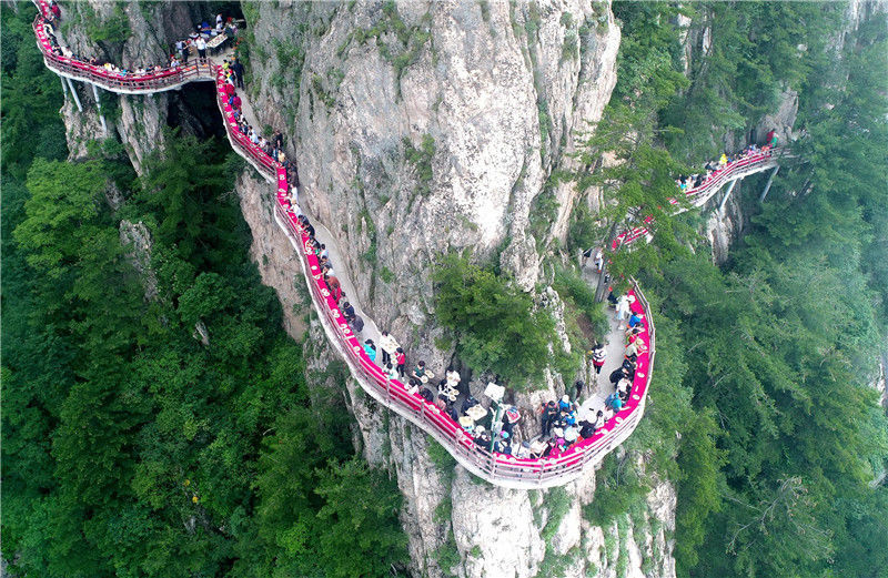 2018年7月8日,河南洛阳老君山举行观海避暑节,在半山腰海拔2000米的悬崖栈道上安排了一场“云海盛宴”,设下免费午餐,让民众免费品尝蘑菇山珍、大虾、时令水果、新鲜果汁,精美点心等。DF/视觉中国