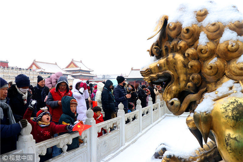 2019年2月12日,一场春雪喜降京城,游人在故宫里与雪相伴开心地游览拍照。游人在故宫里游览。王希宝/视觉中国