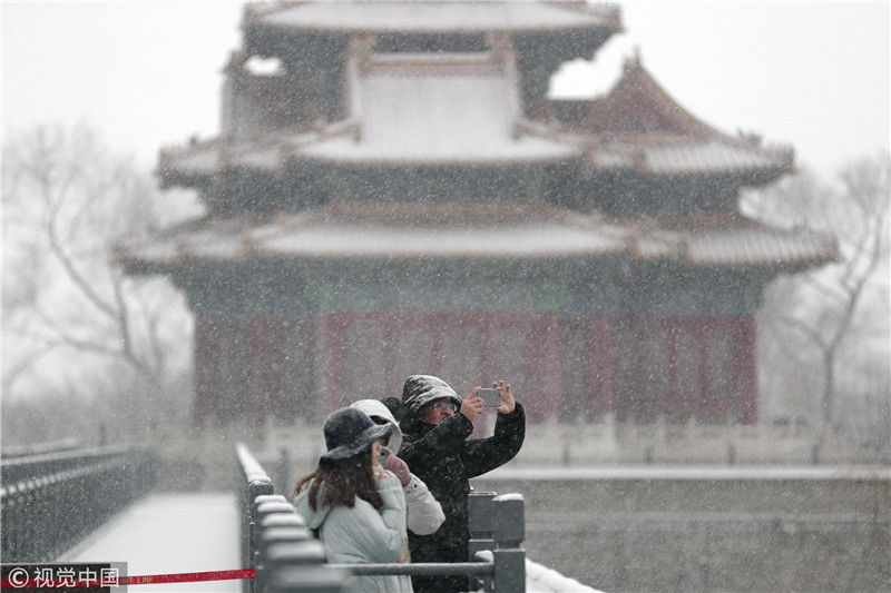 2019年2月12日,北京迎来今冬第二场降雪,游客冒雪参观故宫博物院。盛佳鹏(摄影部)/中新社/视觉中国