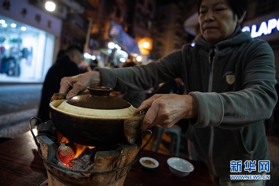 12月3日,在位于澳门新马路关前街街口的“强记羊腩煲”,员工为客人送上羊腩煲。传统的炭火炉与瓦煲边食边煮,羊肉色泽油润且软嫩无膻味,加入支竹、粉肠、萝卜、鱼头及生菜,口感更丰富。这款冬日里的限定美食不容错过。