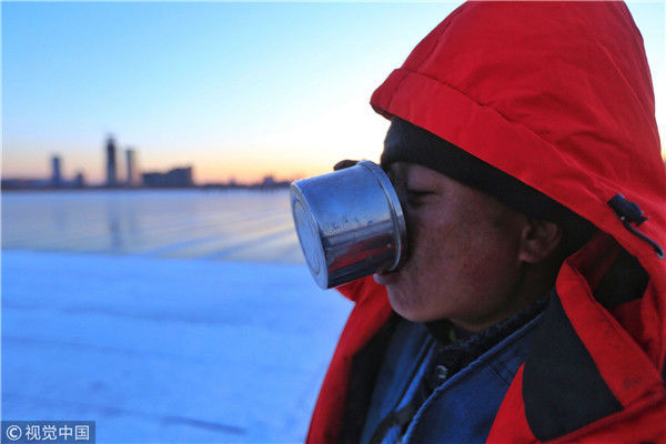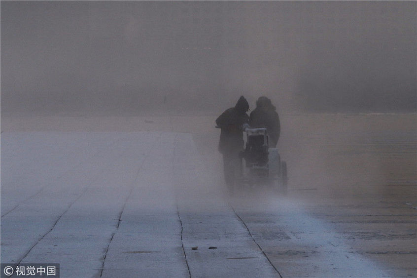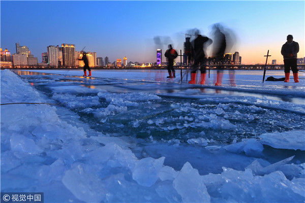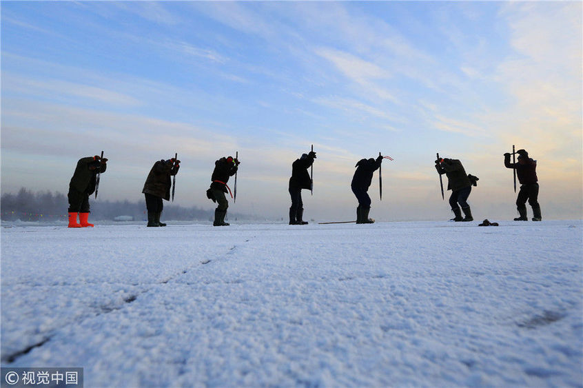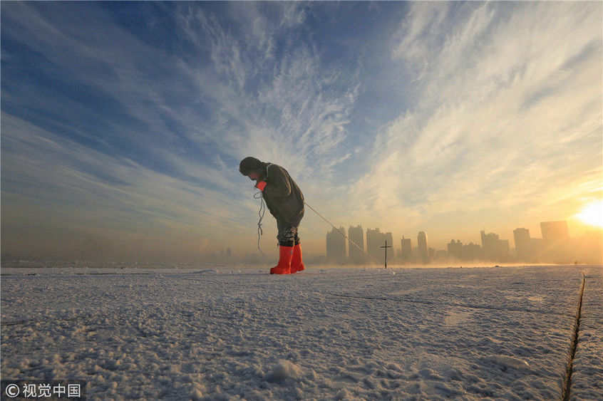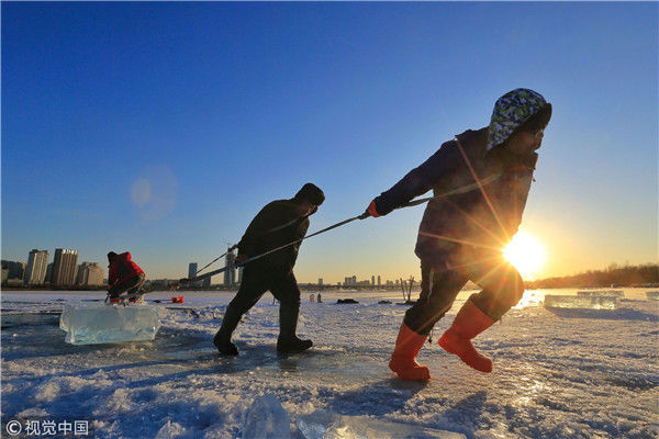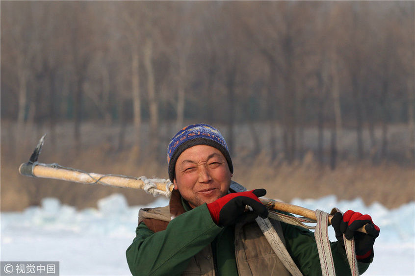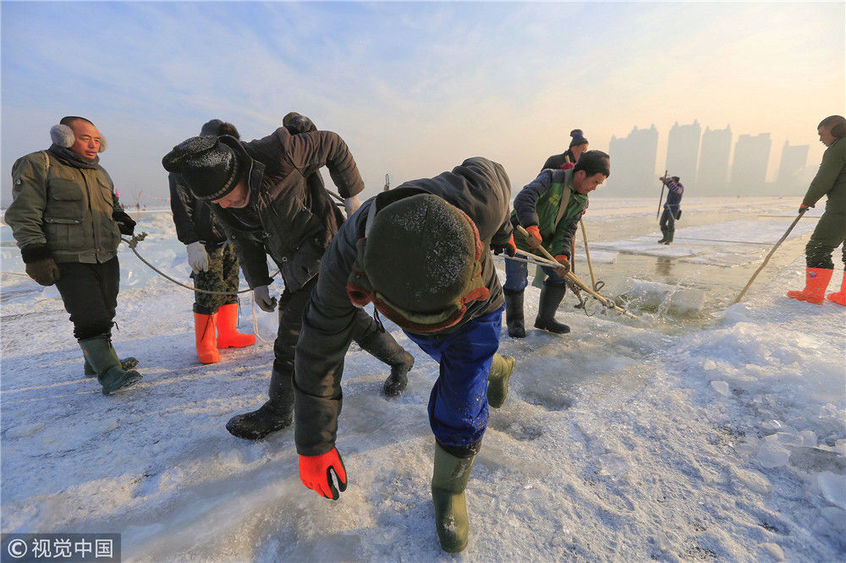 2018年12月11日,黑龙江省哈尔滨市,松花江上,采冰者们弯腰拉绳,宛如纤夫般拽重达半吨的冰块出水。采冰者都是自哈市江北万宝、东发、沙陀子等乡镇的农民,他们每年冬闲时都会亲属、村邻之间结伴到松花江畔采冰,有的采冰人,已经连续干了二十多年。每个采冰季,他们每天要在冰面上工作10-12个小时,每个采冰组,一天要拽出冰块2000-3000块,一个近20天的采冰季,每人能收入近万元。视觉中国
