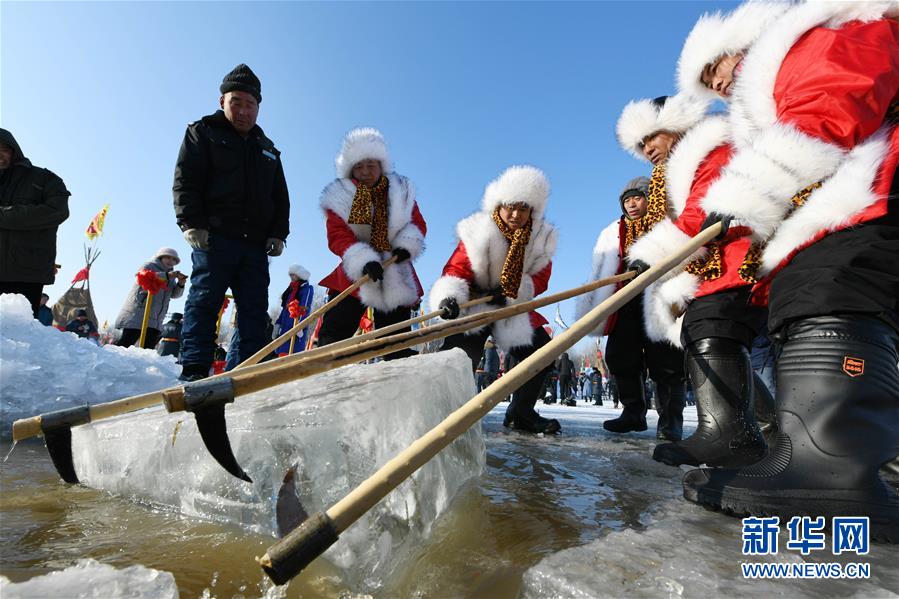 12月7日,人们在采冰节现场采“头冰”。当日,哈尔滨采冰节在冰封雪覆的松花江哈尔滨段江面上开幕,精彩的采冰仪式和表演吸引了众多冰城市民和游客前来欣赏、互动。新华社记者王建威摄