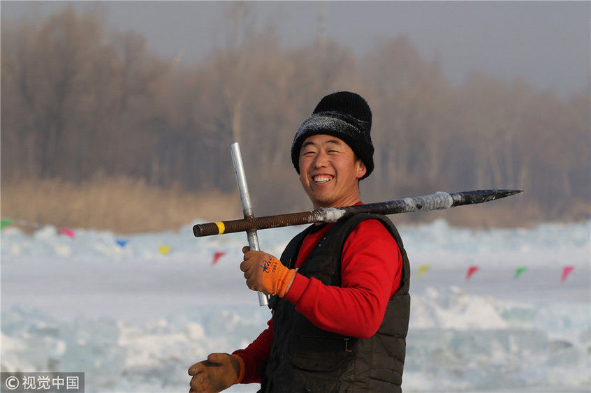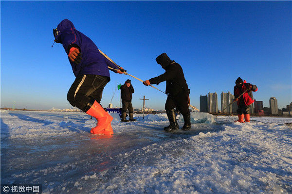2018年12月08日,黑龙江省哈尔滨市,松花江采冰,今日正式出冰。本次采冰,是为第二十届哈尔滨冰雪大世界的建造而进行。视觉中国