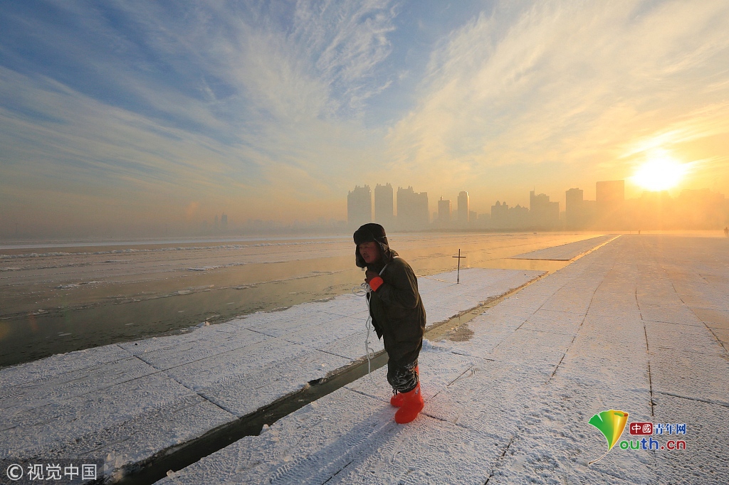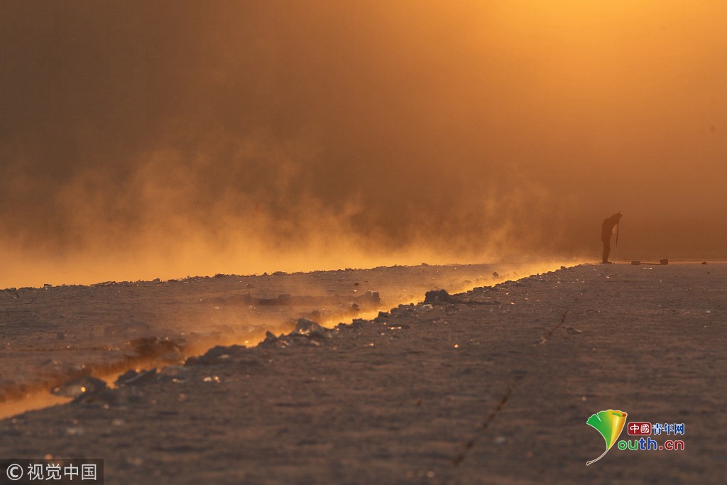 中国青年网2018年12月13日讯2018年12月11日,黑龙江省哈尔滨市,松花江上,采冰人在漫天霞光中破冰、采冰,金色光芒在水雾上升腾缭绕,给劳动的场面增添了诗意。