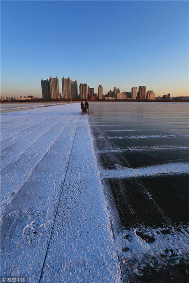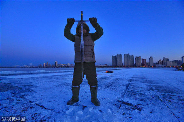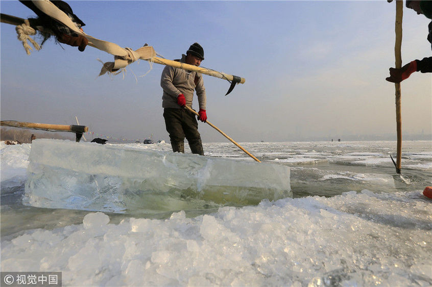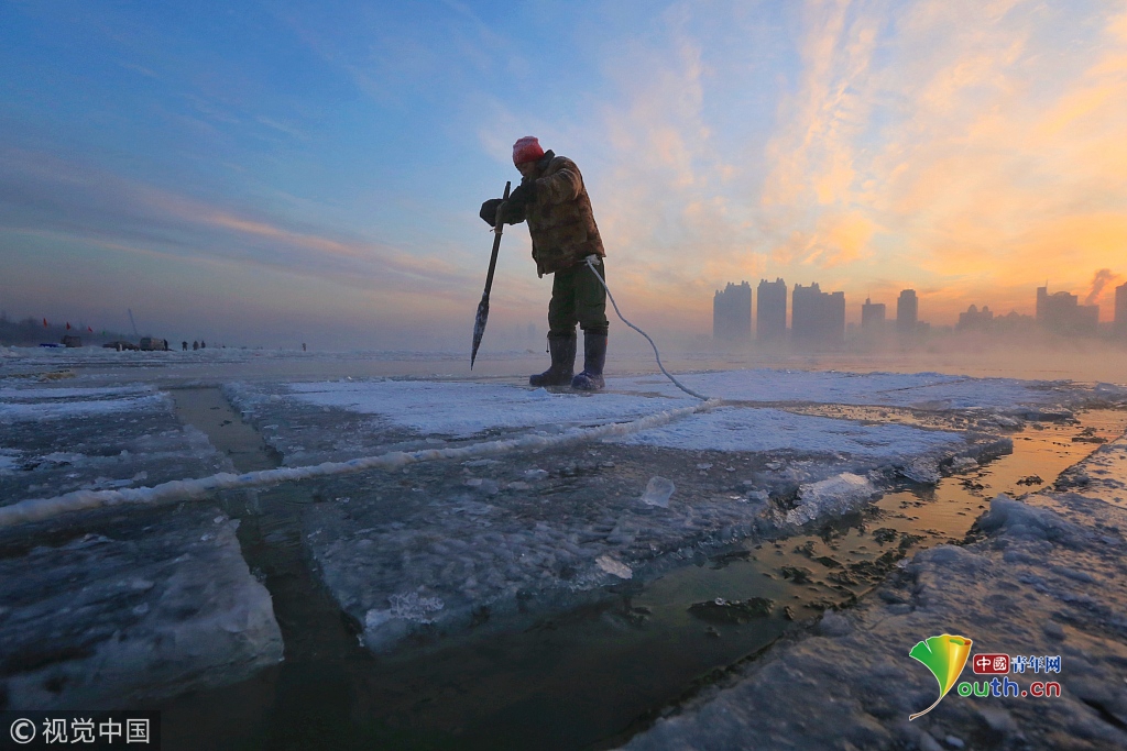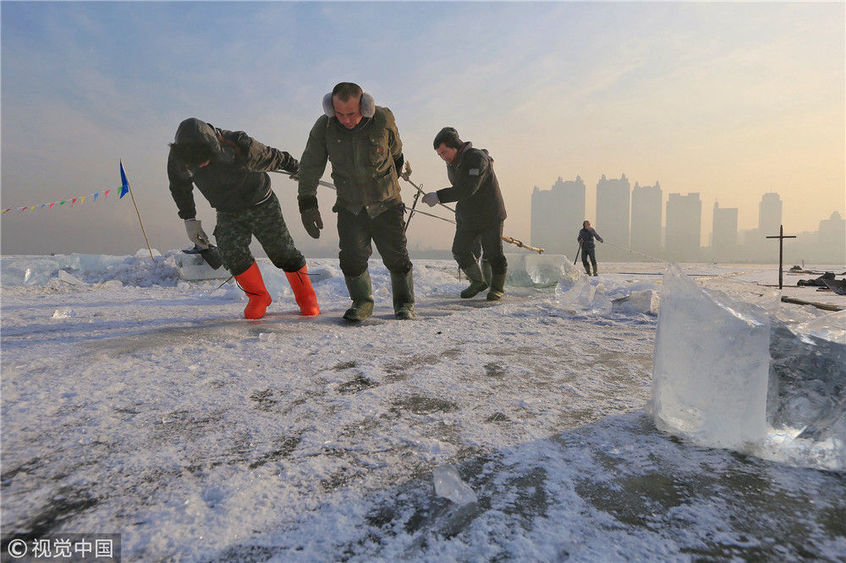 2018年12月8日,最低气温零下22度,哈尔滨市江北公路大桥东侧的江面上,工人们正在从江中捞取冰块,装车运往景区制作冰灯、冰雕。现场,工人先是用电锯、铁钎将冰分割成半米多宽,一米多长的冰块,接着将其拉出水面。等候在旁的叉车上前,将冰装上运冰的卡车,之后装满冰块的卡车驶往景区。