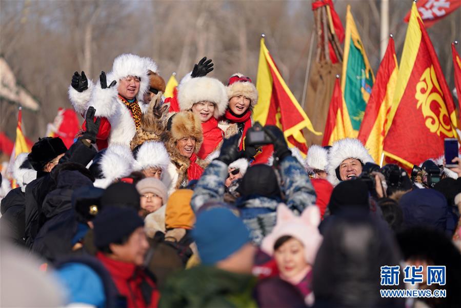 12月7日,人们在采冰节现场合影留念。当日,哈尔滨采冰节在冰封雪覆的松花江哈尔滨段江面上开幕,精彩的采冰仪式和表演吸引了众多冰城市民和游客前来欣赏、互动。新华社记者王建威摄