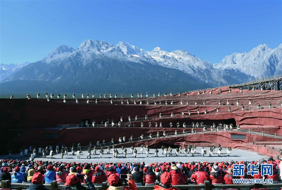 12月10日,游客在玉龙雪山下观看大型实景演出。新华社记者杨宗友摄