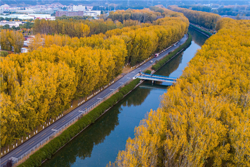 2019年11月03日,北京,京密引水渠昌平段,河道两旁的杨树叶已经变黄,碧水黄叶映衬,秋意正浓。