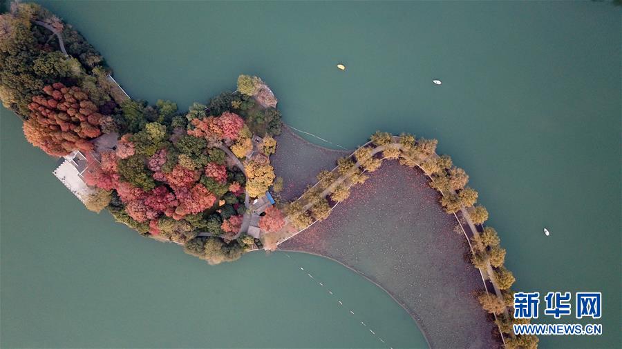 12月10日,小船在湖南烈士公园年嘉湖湖面行驶(无人机拍摄)。新华社记者陈泽国摄