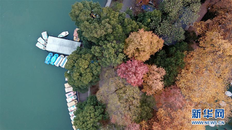 12月10日,游船停靠在湖南烈士公园年嘉湖湖畔(无人机拍摄)。新华社记者陈泽国摄