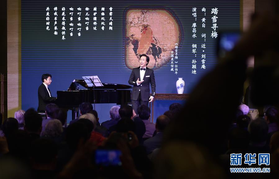 12月10日晚,廖昌永在音乐会上演唱《踏雪寻梅》。 当晚,中国古典诗词与书画——廖昌永中国艺术歌曲独唱音乐会在北京中国美术馆举行。 新华社记者 鲁鹏 摄