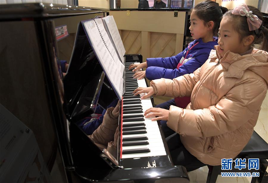 两名小朋友在洛阳天心文化产业园内的钢琴文化艺术馆内弹琴(12月3日摄)。新华社记者李安摄