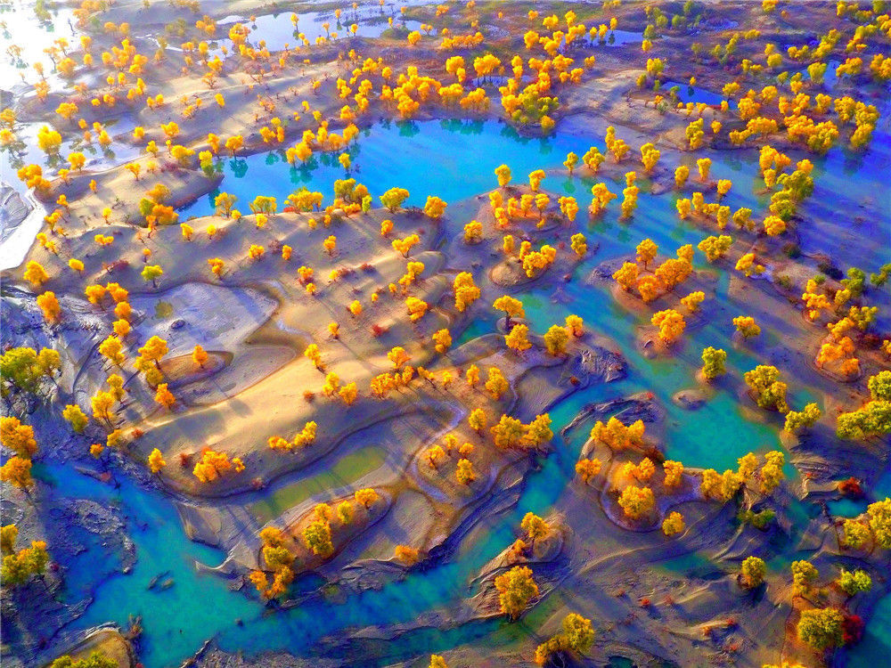 2016年11月2日,航拍的新疆塔里木河尉犁县段胡杨林。胡热/视觉中国