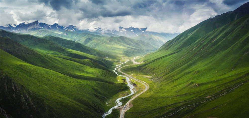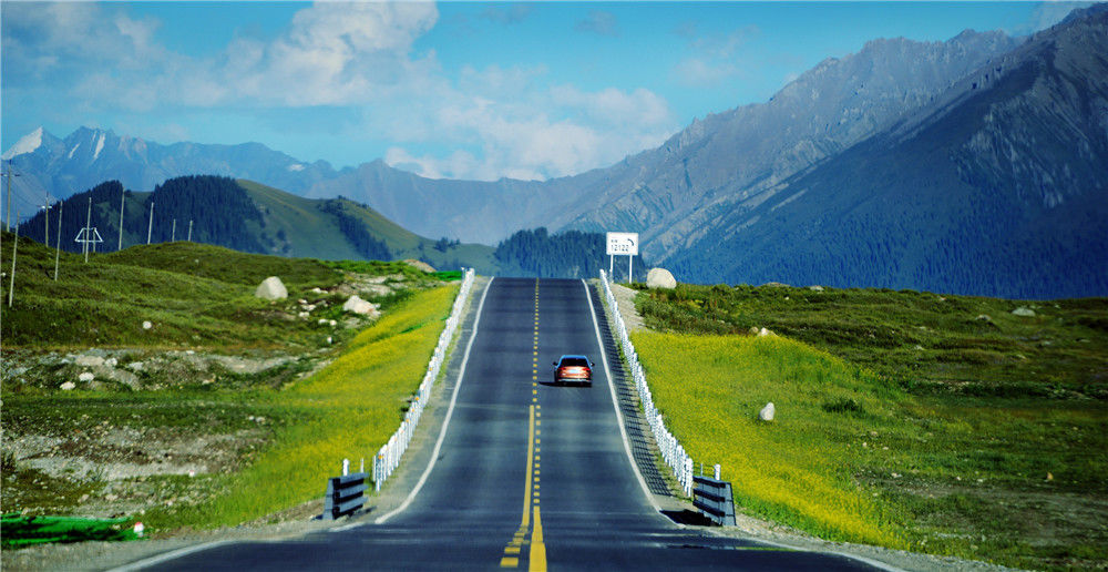 2019年7月10日,新疆独库公路蜿蜒在天山山脉的草原山谷中。黄光浩/视觉中国