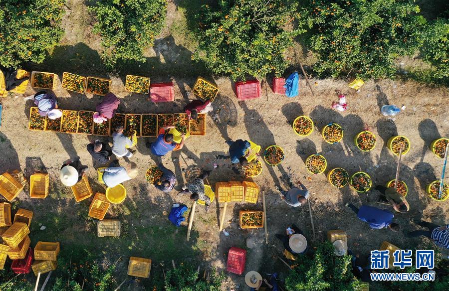 12月11日,广西柳州市鹿寨县四排镇四排村村民在果园里将砂糖橘装箱(无人机拍摄)。