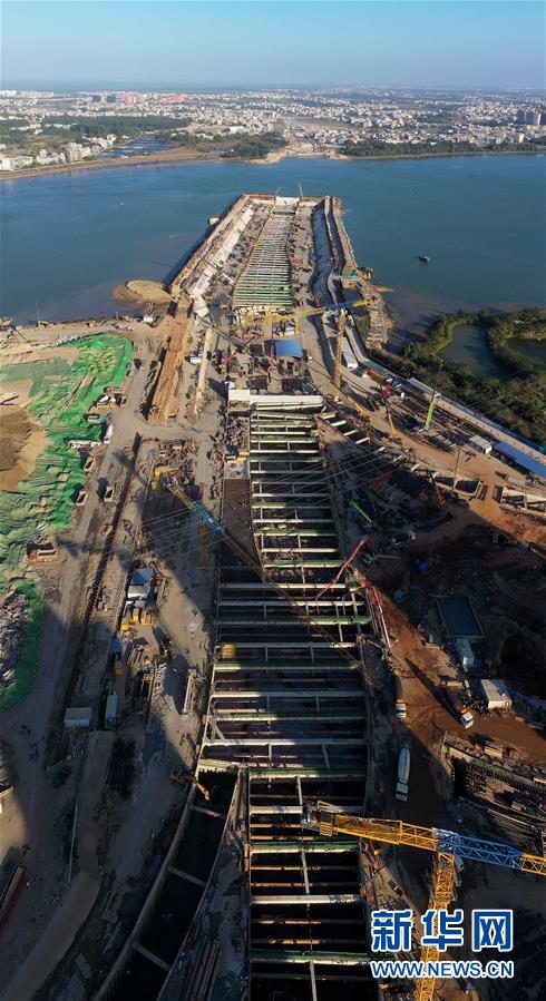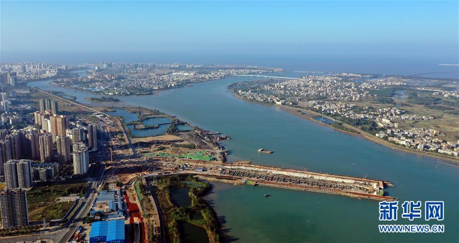 正在施工的海口文明东越江通道项目(12月14日无人机拍摄)。 海口文明东越江通道项目是连接海口主城区和江东新区的重要纽带,2018年底开工,全长4.38千米,其中隧道段2.72千米。据了解,目前项目总工程量已过半,将力争在2020年4月份建成并实现功能性通车。 新华社记者 郭程 摄