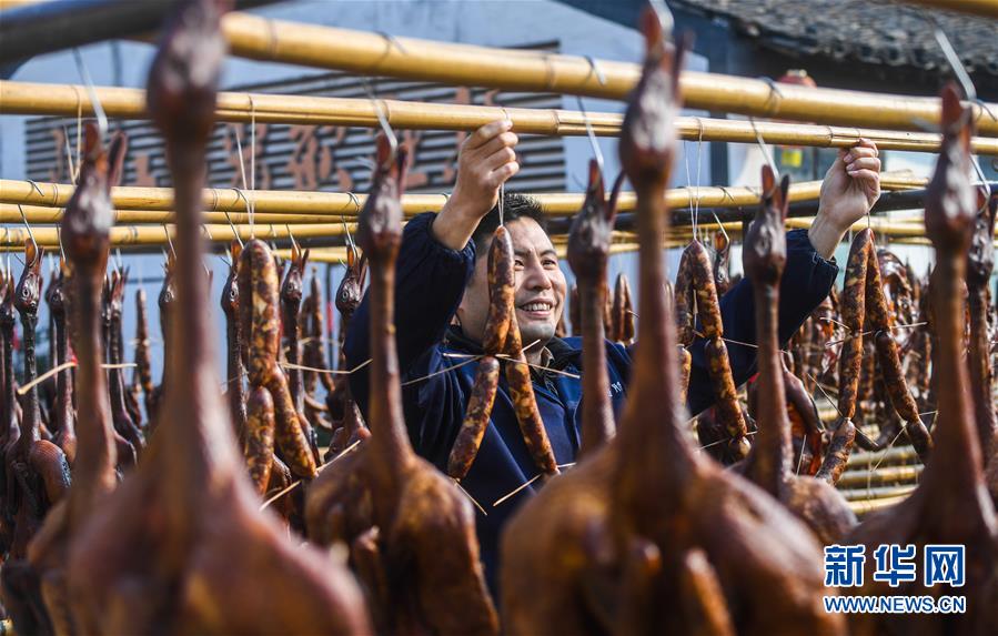 12月3日,安昌古镇一家名为阿红香肠的传统腊味作坊里的工作人员在晾晒各种手工制作的绍兴腊味。新华社记者徐昱摄