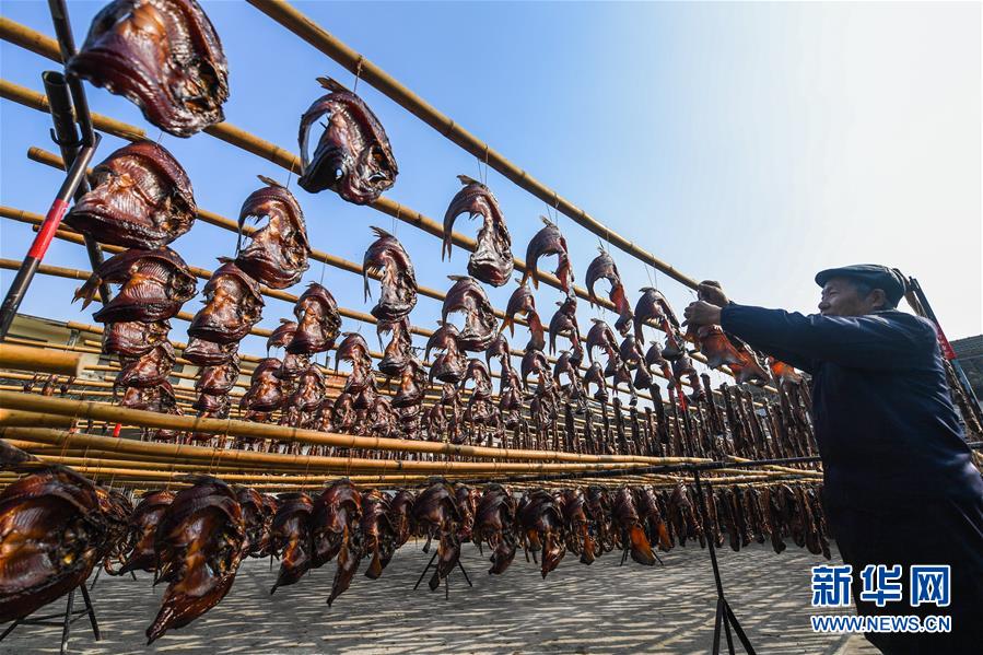 12月3日,安昌古镇一家名为阿红香肠的传统腊味作坊里的工作人员在晾晒各种手工制作的绍兴腊味。新华社记者徐昱摄