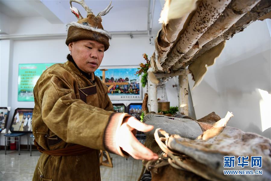12月10日,在古里乡非遗传习所,鄂伦春族人吴曲忠在整理皮毛制品。新华社记者刘磊摄