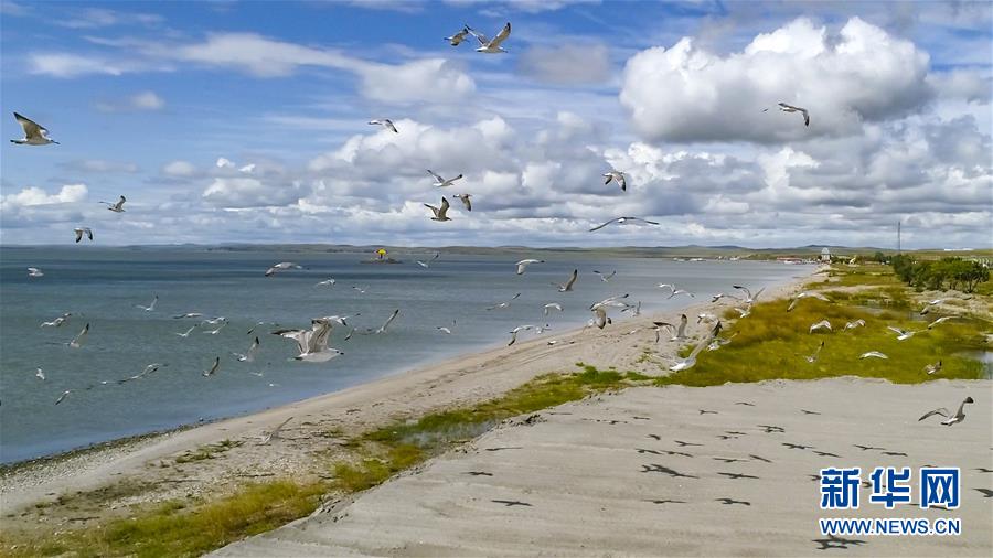 8月28日无人机拍摄的呼伦湖畔的水鸟。新华社记者沈伯韩摄