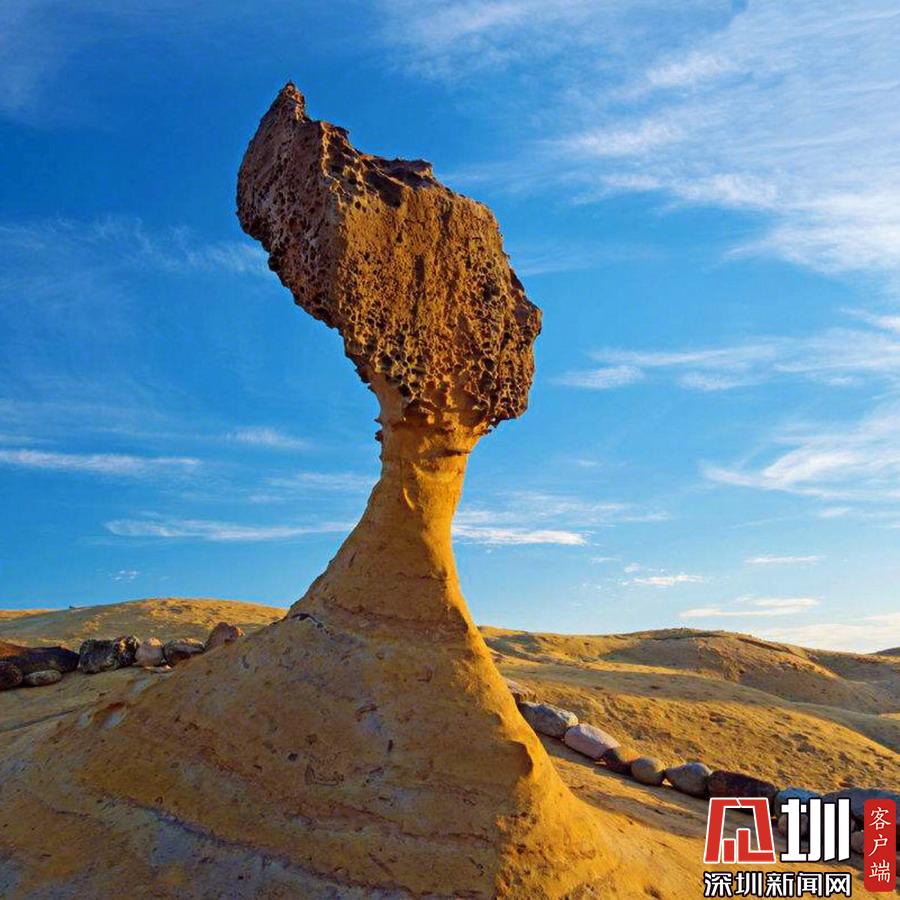 野柳地质公园(Yehliu Geopark),位于台湾新北市万里区,野柳是突出海面的岬角(大屯山系),长约1700公尺,由于海蚀风化及地壳运动等作用,造就了海蚀洞沟、蜂窝石、烛状石、豆腐石、蕈状岩、壶穴、溶蚀盘等绵延罗列的奇特景观。孙逊摄