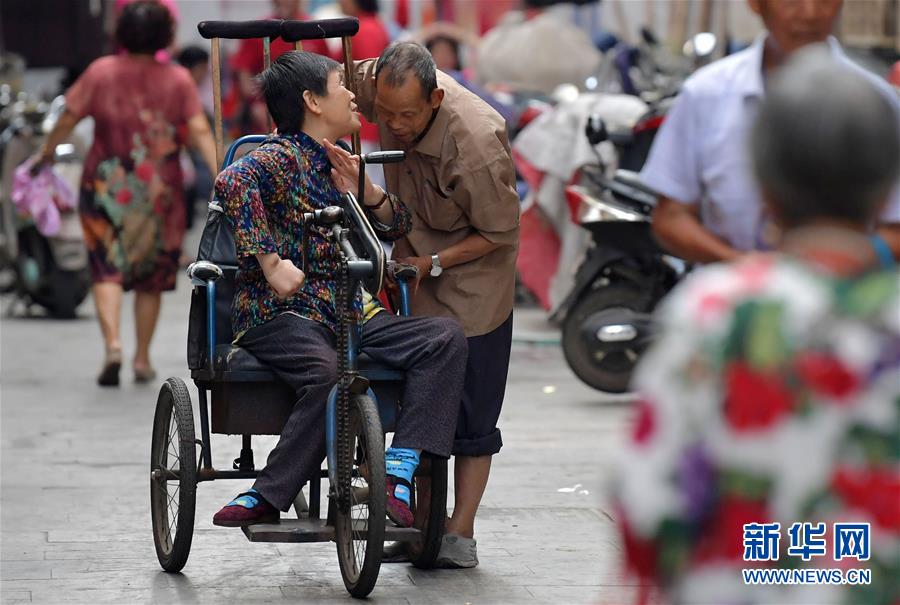 叶文娟在熊金根耳边交代要买的东西(10月2日摄)。江西省南昌市西湖区绳金塔社区有一对特殊的夫妻,74岁的丈夫熊金根听力残疾,67岁的妻子叶文娟患小儿麻痹症后行动不便。夫妻二人相互照顾相濡以沫度过了30余年。新华社记者彭昭之摄