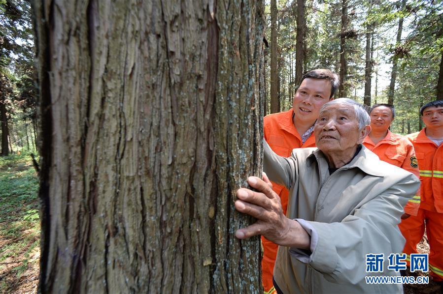4月27日,在贵州省毕节市赫章县平山国有林场,李代关老人(前)在查看当年和同事种的杉树。今年88岁的李代关是贵州省毕节市赫章县平山国有林场的一名退休职工,他1958年参加工作,成为一名林业工人,把毕生奉献给了林业事业。在李代关的感召下,他的儿子和孙子都成为了护林员。经过几代林业工人的努力,截至2018年底,赫章县平山镇的森林覆盖率已达66.7%。新华社记者杨楹摄