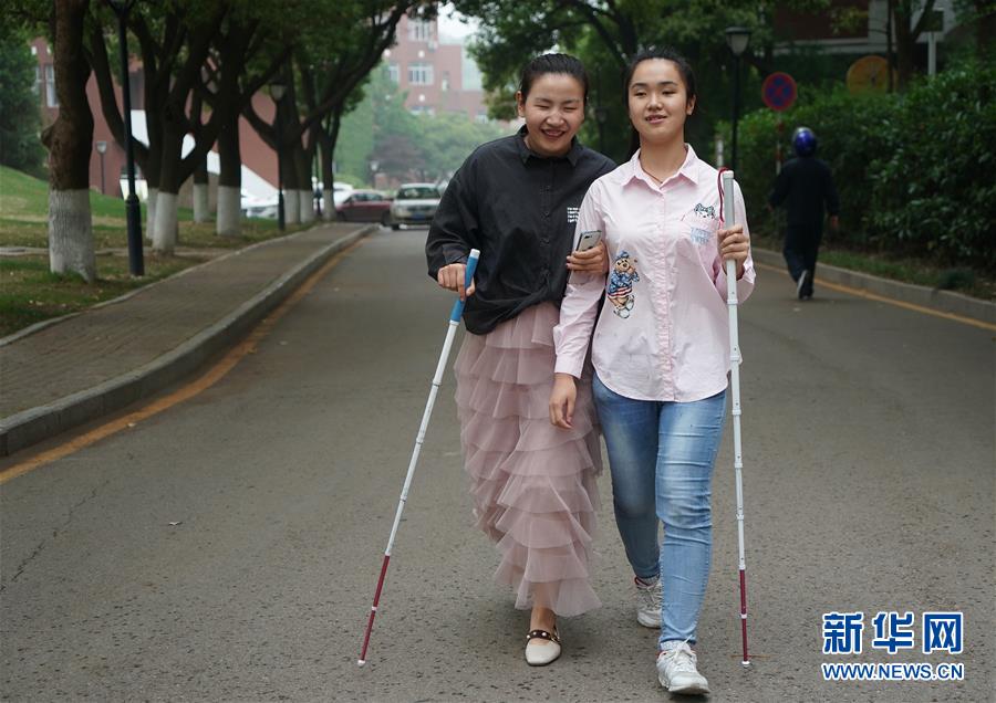 5月17日,在南京特殊教育师范学院,周文晴(右)和邬逸帆走在校园内。1997年出生的邬逸帆和1998年出生的周文晴都是从小失去视觉。她们学习努力,相互帮助,大学生活和同龄人一样丰富多彩。新华社记者季春鹏摄