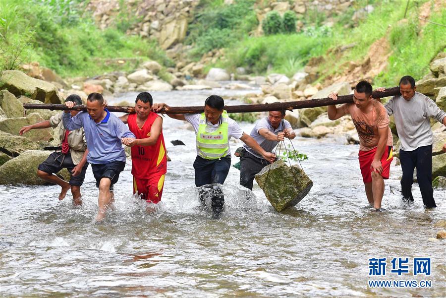 在位于黔桂交界的乌英苗寨,驻村第一书记韦桂华(右四)、党员梁成兵(右三)、梁志新(左二)带领村民维修河堤(6月30日摄)。乌英苗寨联合党支部在各项工作中积极发挥引领作用,带领群众稳步走在脱贫致富的道路上。新华社记者黄孝邦摄