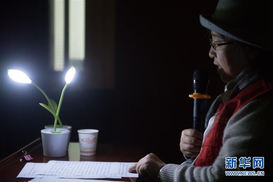 4月11日,吴素环在中国盲文图书馆桐庐县支馆为视障人士解说电影《可可西里》。65岁的桐庐老人吴素环是一名进行性肌萎缩症患者,也是一名无障碍电影解说志愿者,自2015年起已为当地视力障碍者解说四部电影,每部电影上万字的解说词都由她自己写成。新华社记者翁忻旸摄