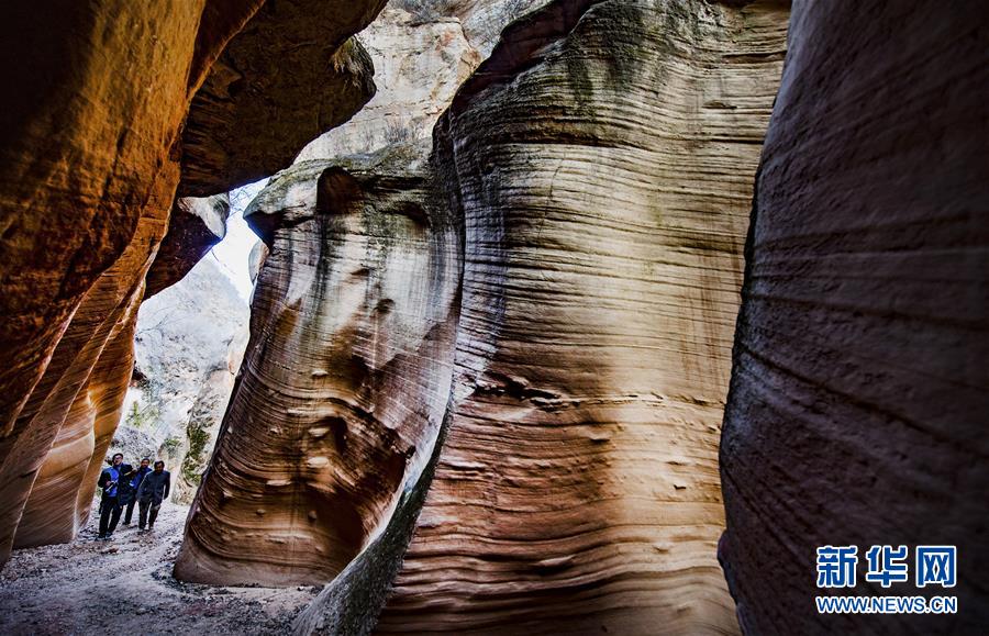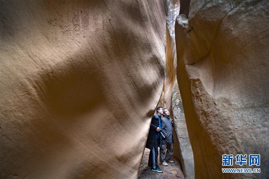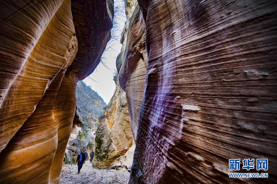 12月17日,游人在志丹县双河镇毛项峡谷内游览。毛项峡谷位于陕西省延安市志丹县双河镇毛项村,峡谷全长12公里,分为9段,曲折绵延,谷内石壁凹凸不平,其中最窄处只能容一人侧身通过,堪称黄土高原上的自然奇观。新华社记者陶明摄