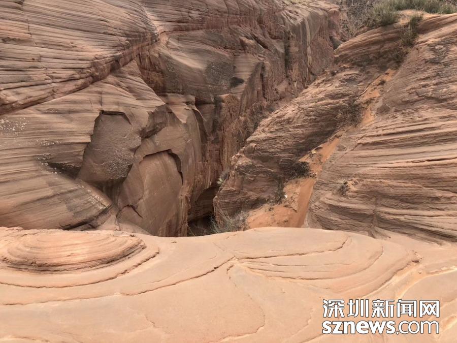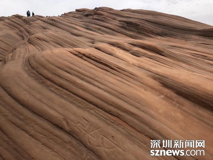 沙丘不断地被一层层浸渍了地下水的红沙所覆盖,天长日久,水中的矿物质把沙凝结成了砂岩,形成了层叠状的结构。孙卫南摄