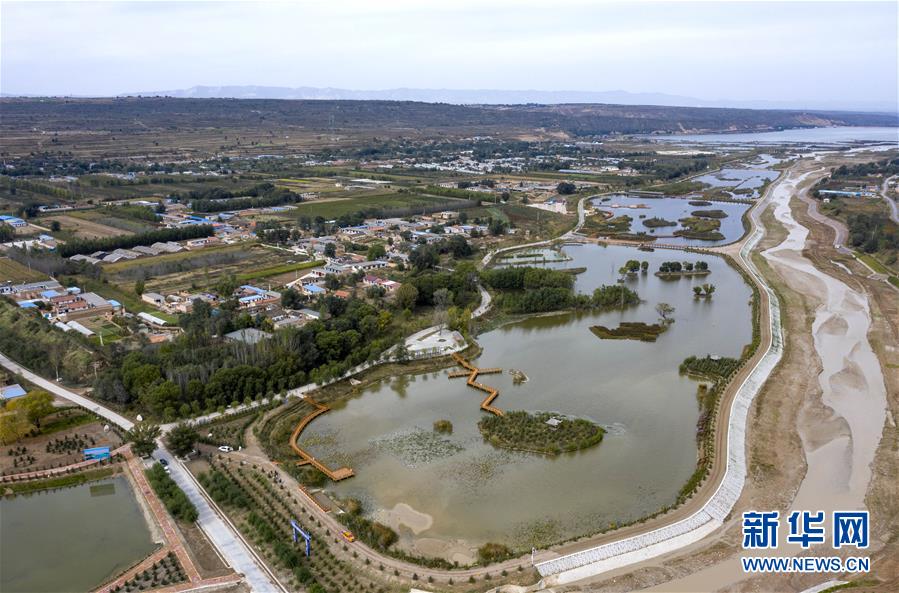 宁夏固原市原州区境内的清水河流域在进行防洪加固和人工湿地工程建设(10月10日无人机拍摄)。 新华社记者 冯开华 摄