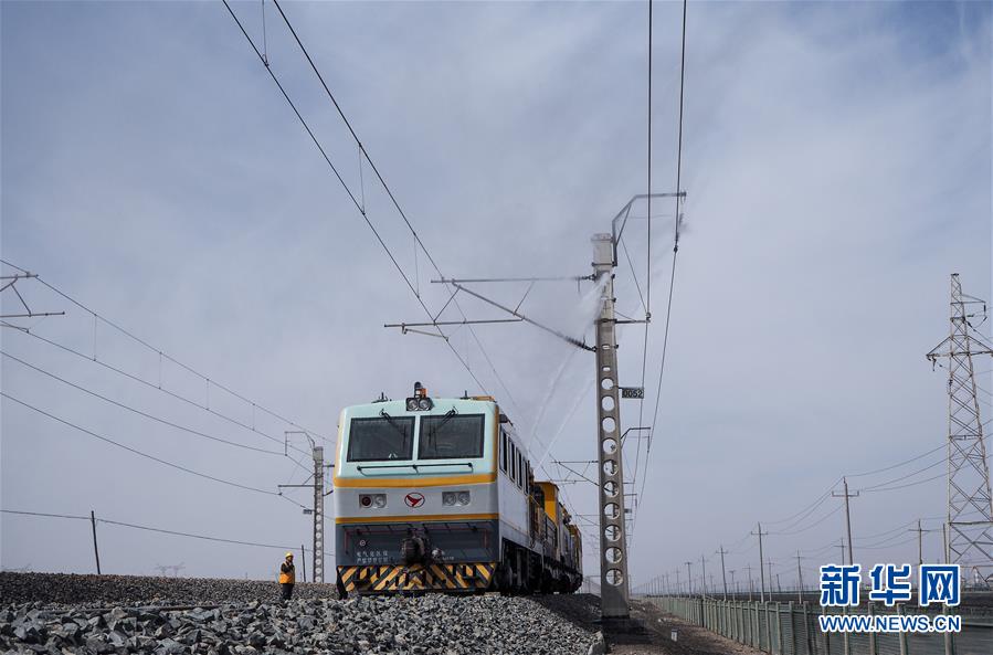 青藏铁路公司西宁供电段格尔木大修车间的接触网清洗车在清洗绝缘子(5月12日摄)。新华社记者白玛央措摄