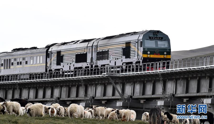 这是羊群和青藏铁路上行驶的列车(6月10日摄)。新华社记者觉果摄