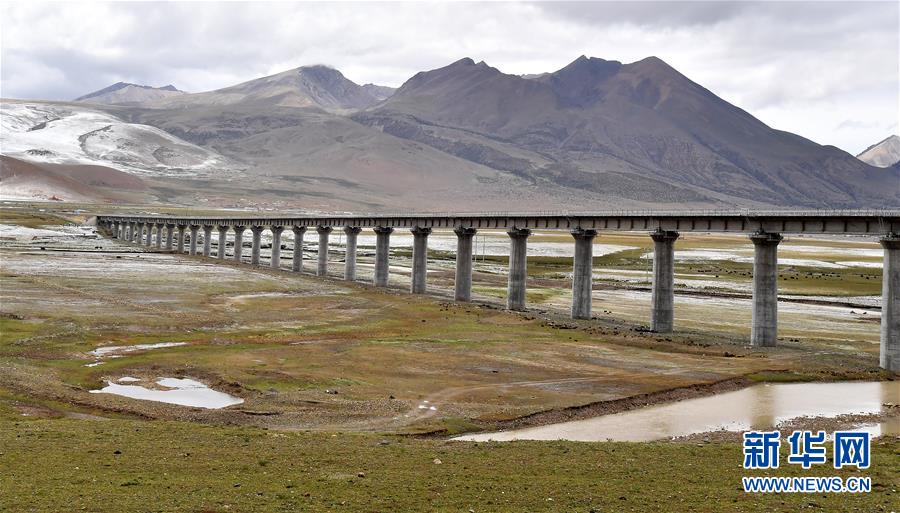 这是穿过一片湿地的青藏铁路(6月10日摄)。新华社记者觉果摄